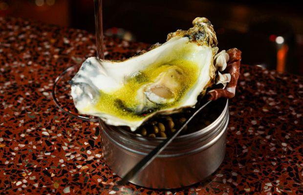 The menu's logic is its own: split between oyster drinks, uni drinks, and a chapter called "excessive is necessary", where you find the 4 Cheezus that pairs pecorino distillate with Madeira wine, mozzarella water, gin and wild honey. Every drink is paired with a bite, somewhere between garnish and side-dish: Ikura bombs, ramen spheres, pandan cakes or truffle chicharrón, always to frame, contrast with, or extend what's in the glass. Blue cheese foam, minced meat vodka, banana vinegar, oyster juice – ingredients that could easily overwhelm – are handled with precision and control. Surreal? Yes. Sacrilegious? Might be. But everything is international and provocative in all the right ways.