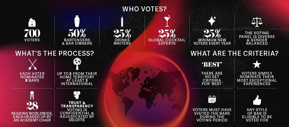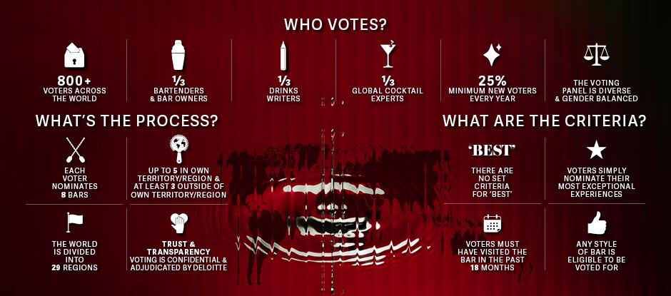 Each voter casts eight votes based on their best bar experiences of the previous 18 months, with a maximum of five bars in their own country (SAR in Asia, province in Canada or state in USA).