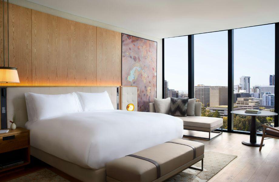 Set along the Swan River, at Elizabeth Quay, Ritz-Carlton Perth cuts a striking figure. Towering over the city below, it speaks a language of simplicity and refinement. Taupe, natural wood and clean lines are recurring mottos across the modern space, which has taken Western Australia’s landscape as its moodboard, though they’ve turned the volume down just a smidge. Bedrooms are contemporary, warm and feature well-chosen furniture that nods to mid-century styles. Large pieces of modern art fleck the space, with its lofty ceilings a signature of most modern skyscraper hotels, so too the abundant floor-to-ceiling windows. Views of the river frame hours whiled away in the fifth-floor infinity pool (or neighbouring bar) and there’s welcoming adjacent spa area offering myriad treatments. Back on terra firma, Hearth is the property’s flagship dining room, a large fresh-faced affair with tables tripping onto a terrace facing the water beyond. Highlighting the flavours of the region (along with its artisans and producers, of course), everything is cooked on an open fire and paired with local wines.