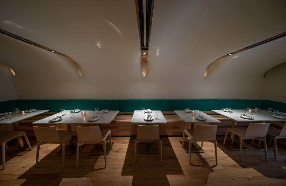 Low, undulating ceilings aglow with soft recessed lights set a dramatic tone for the interiors at Quetzal, a high-end Mexican restaurant in Toronto’s Little Italy. The metaphorical heart of the space – and the cuisine – is a 28-foot long wood fire that flanks the dining room, where local produce, seafood and meat meet the flames before being judiciously composed onto beautiful earthenware plates. Tortillas nixtamalised in-house form a warming base for memelas and empanadas and the dessert menu also features treasures such as epazote raspados and a spiced Mexican chocolate tres leches. The wine list skews international, with options from most famous wine-producing countries included, plus a hearty section of reds and skin-contact whites by the bottle. Mezcal, tequila, and other Mexican treasures are also offered by the pour or mixed into clever house cocktails.