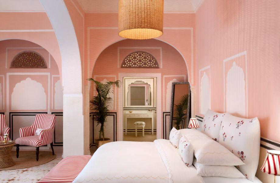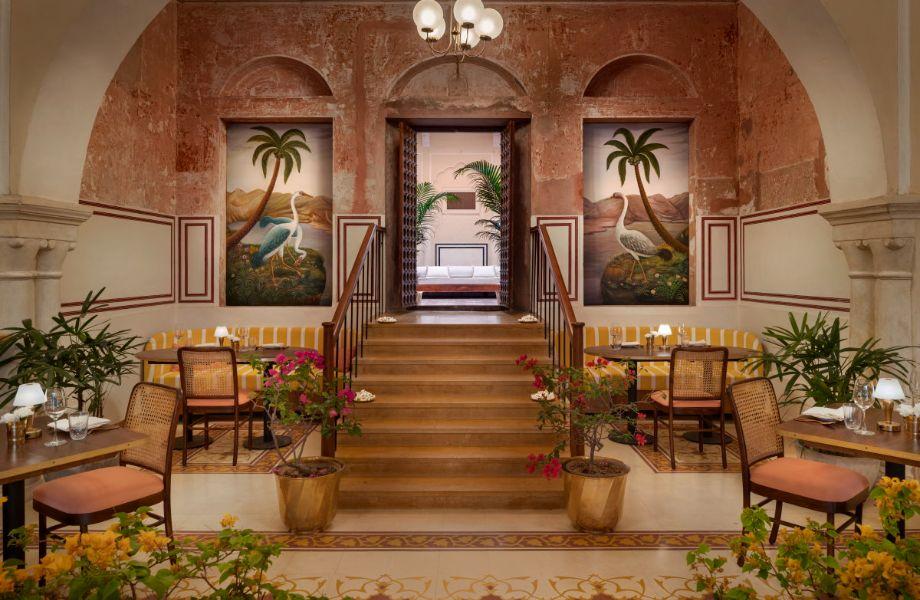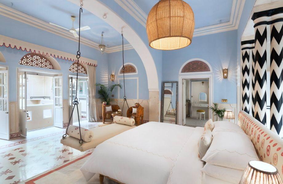 Hip hoteliers Siddharth Kasliwal and Abhishek Honawar opened The Johri in 2020, in the heart of one of Jaipur’s oldest markets, the Johri (jewellery) Bazaar. Just like its location, the 19th-century haveli-turned-boutique hotel is layered with intriguing colours, textures and contrasts. New York-based designer Naina Shah is behind the stand-out-from-the-crowd interiors, which juxtapose Rajasthani design, antiques and textiles with flair. Each of the five spacious suites is a gem in its own right, drawing on different jewels for its unique aesthetic – and so you have the Manek (ruby) in shades of dusty pink; the Neelam (sapphire), which comes in the palest of blue complete with a cushioned hanging loveseat and black-and-white striped columns; and the top-floor Moti (pearl) with its dressing room, living room and private verandah. The suites overlook a quiet inner courtyard, off which you’ll also find cool, calm nooks and crannies to escape the heat of the day. Take afternoon chai beneath the bright Rousseau-like murals in the Pukhraj Lounge; while the pretty-as-a-picture restaurant serves organic, vegetarian Indian fare including chaat, biryani and an incredible selection of breads.