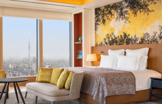 What about the rooms? The moment guest room doors open, blinds rise to reveal cinematic Tokyo views. The décor is no less eye-catching, with swathes of elm wood, matte gold ceilings and saffron-toned textile headboards, while spacious Bulgari-esque black granite bathrooms up the glam factor.