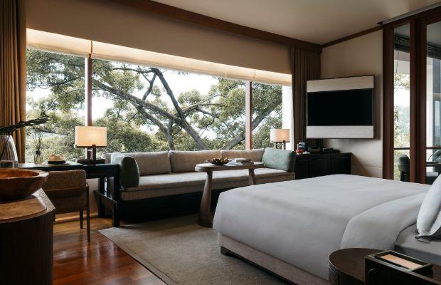 What’s the vibe? Combining 1880s colonial architecture (the main building is the former officers’ mess of the British Royal Artillery) with the curving ochre lines of the new Foster + Partners-designed wing, all set in 30 acres of lush, landscaped gardens where peacocks roam, Capella Singapore feels like a tropical fairy tale. With calming interiors by Indonesian designer Jaya Ibrahim, a three-tier pool and views over the South China Sea, the sense of tranquillity here makes it hard to believe the bustle of Singapore exists somewhere just beyond the tree line.
