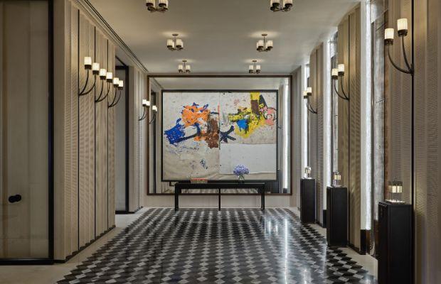 Tell me more about the design: New York-based designer Tony Chi has created a vivid fusion of east and west within this vertical estate. The hotel's logo is integrated into the main entrance's door handles. Guests are immersed in colour and texture upon entering – from patterned floor tiles to paintings and sculptures by the likes of Damien Hirst, Lynn Chadwick and Wang Keping. Lift vestibules on each floor resemble sitting rooms filled with books and objects d'art to enhance the feeling of a residence.
