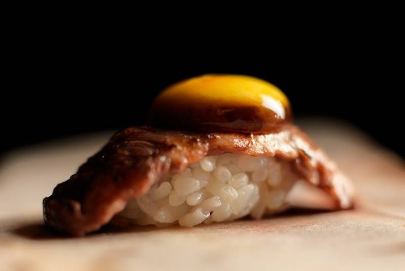 In Peru, as in other parts of Latin America, the staple combination of rice, eggs and plantain is known as à lo pobre, or 'poor man's style'. Add protein on top for steak à lo pobre. When Tsumura opened Maido in 2009, he wanted to make sushi but with beef, inspired by the wagyu sushi he'd made in Japan. The inaugural version featured Angus skirt steak, plantain cream and a quail's egg, and it's remained on the menu ever since. These days it's similar, but with wagyu short rib and ponzu sauce injected into the yolk. Maido started a movement for beef sushi in Peru, which appeals to those who don't fancy raw fish. "Nowadays, beef sushi is everywhere," says Tsumura.
