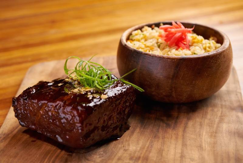 In Japan, nitsuke means 'to stew', and can be applied to fish or meat. Tsumura loves beef so he created a signature version where short rib is cooked for 50 hours and served with a sweet and savoury glaze, crispy garlic on top, and a side of fried rice with cecina, or Amazonian smoked pork. For 10 years, it was the final course of the tasting menu, but diners can now order it a la carte. "This is the signature of Maido," says Tsumura. It's so tender, you can cut it with a spoon.