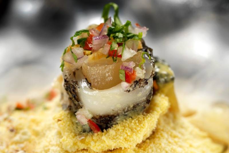 The fried fish sandwich is a typical breakfast for the fishermen of Lima's Port of Callao. For many years, Tsumura made his version with pejesapo, or frog fish, a collagen-rich fish often used in Chinese-Peruvian cuisine that suckers itself to the rocks in shallow waters. Nowadays, there are few frog fish available, so the team serves it with the catch-of-the-day such as grouper, snapper or cod. It was on the tasting menu for eight years and is now a favourite of the a la carte. "People went crazy for it, and they still go to Maido for this dish," says Tsumura.