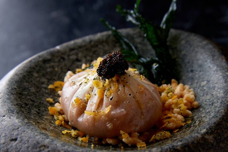 This marked a turning point in Tsumura's passion for collagen, which he had always used to add texture and creaminess to hot dishes, and now begun applying to cold plates. In this tiradito, raw hamachi is cut into thin slices and served with dots of yellow Amazonian tomato cream sauce, and leche de tigre (tiger's milk sauce) with added beef collagen for a thicker texture. Tsumura now plays with beef and pork collagen in all kinds of hot and cold dishes, preferring it over artificial thickening agents. Today, you'll find tiradito on the a la carte.