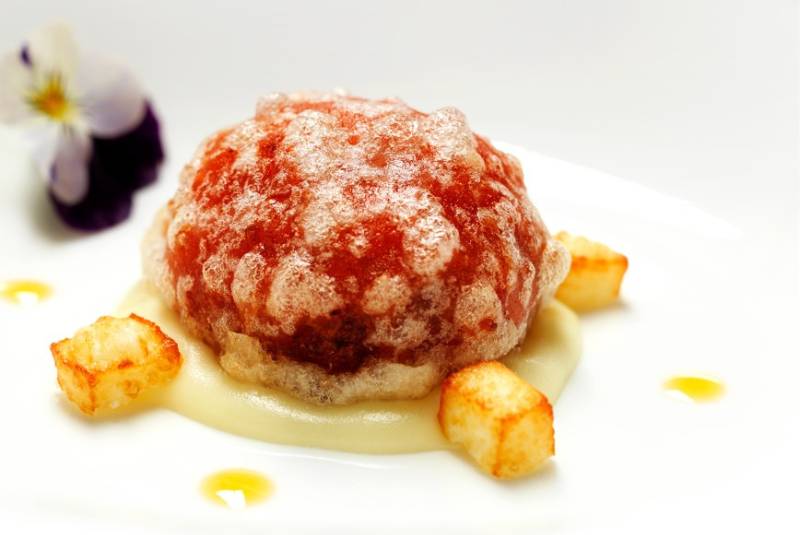 Though the rocks are no longer on the menu, there's always a snack featuring the same creamy chorizo foam, most recently in a tartlet with nuts and yacón, a tuber. Made from a special chorizo he sources from the Amazon, the foam is smoky, umami, meaty and creamy. Just don't try to eat the real rocks served under the edible ones.