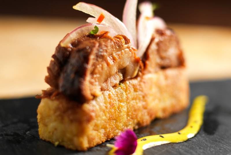The dish that put Maido on the map, Tacuchaufa is a modern take on two Asian Peruvian classics: tacu-tacu (rice and beans), and chaufa, Chinese-Peruvian fried rice. Maido had not long been open when Tsumura was invited to cook at Lima's popular Mistura Food Festival in 2010. He made his version, featuring rice, beans and tender pork belly, slowly simmered in a sake, soy and mirin sauce. Soon there were lines of people queueing up to buy it – in fact, it was Mistura's top-selling dish that year.