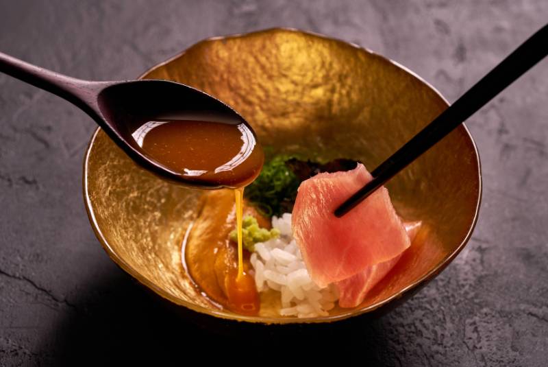 One of the most photographed parts of the Maido experience is when a huge tuna belly is brought to the table and sliced in front of the diner. Tsumura's team have served fatty tuna belly in many ways, from donburi to blow-torched nigiri and hand rolls with unagi. This version, made for Maido's 15th anniversary in 2024, was presented in a bowl with sushi rice, sea urchin, egg yolks cured in soy sauce, and toro marinated in ponzu with Amazonian lime. Just mix everything together and enjoy!