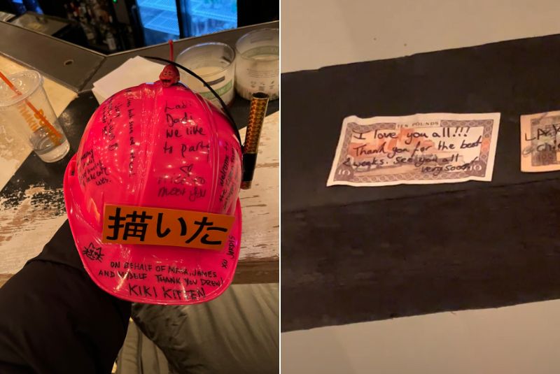 Fleming was given a signed hard hat as a leaving gift, as well as his own personalised dollar bill to add to those that line Katana Kitten's ceiling