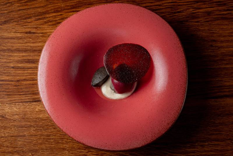 Ikoyi's category-defying menu comprises suprising combinations, such as this cherry and babganoush dish