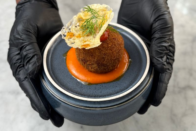 Nwabunike reimagines Nigerian jollof rice for his dish, creating an arancini stuffed with Parmigiano Reggiano