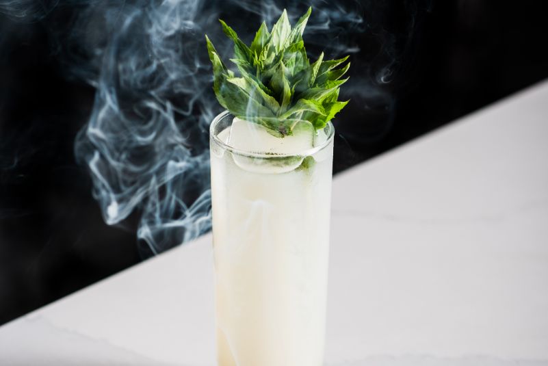The Venado, featured on the Call of the Wild menu, reimagines the classic mojito with a minimalist flourish. This clarified, force-carbonated rum cocktail uses Mayan ingredients such as oregano-infused rum, hoja santa with chocolate crumb, and Mayan lime and salvia oleo saccharum. The result is a clean, herbal sipper with a mint-chocolate chip flavour.