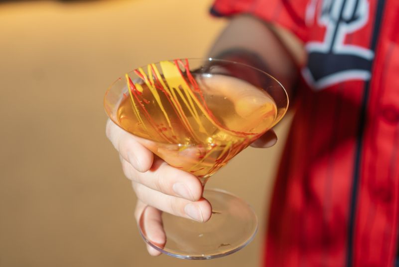 Tokyo Confidential’s debut menu, Second Base, honours baseball’s hotdog snacking traditions with the Glizztini – a savoury tribute to the Gibson. Mixing gin, mugi shochu, tomato pickle, Lillet Blanc, mezcal, onion brine and MSG, it’s served in a short martini glass with red and yellow cacao butter, mimicking ketchup and mustard, theatrically dispensed tableside. An unexpected hit, this cocktail knocks it out of the park.