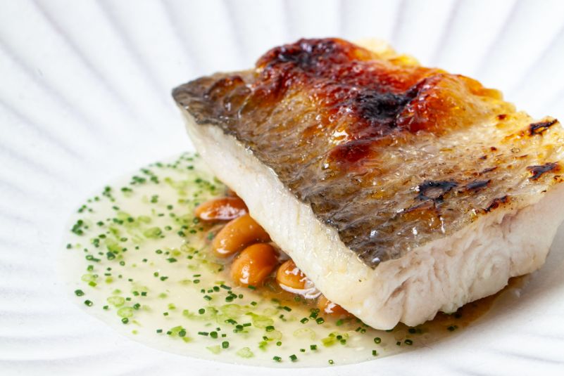Crispy threadfin, braised soy bean and chicken fat soy emulsion at Mora