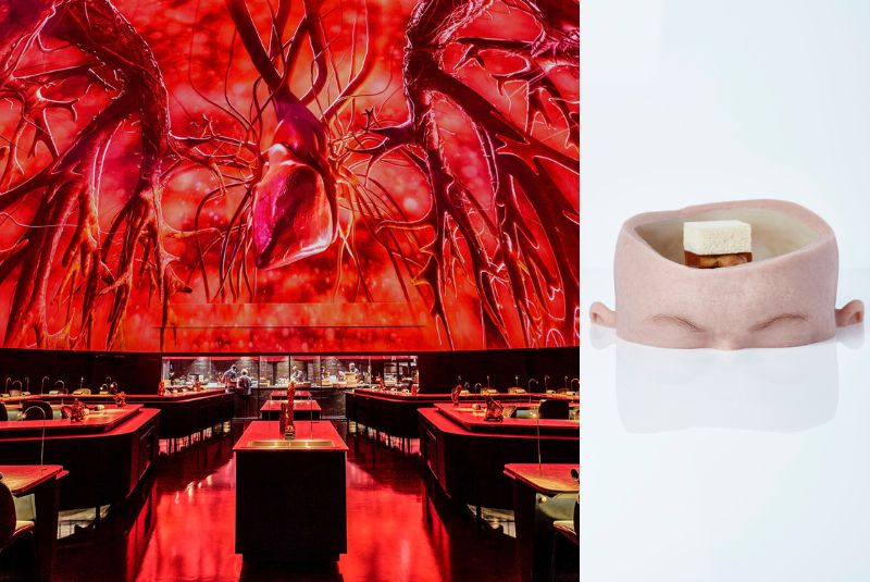Some of the more extreme dishes, or ‘impressions’, include: Food for Thought – steamed lamb’s brain served on brioche and presented inside a model of a human head, designed to prompt discussion on food waste and differing perceptions of what is edible; and Lifeline – an ice cream dessert made with pig’s blood, cast in the shape of a droplet of blood, that aims to encourage people to donate blood themselves.