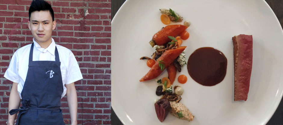 Header images: Andersen Lee and his dish with duck, carrot, shiitake mushroom and coffee