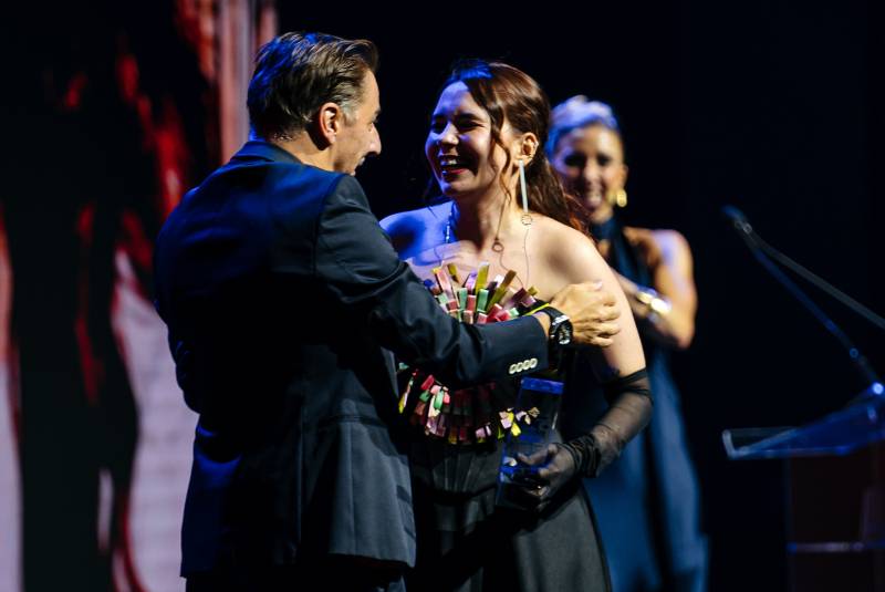 Angélica Ortiz on stage at The World's 50 Best Restaurants 2025 awards ceremony, with Jordi Roca of El Celler de Can Roca