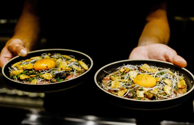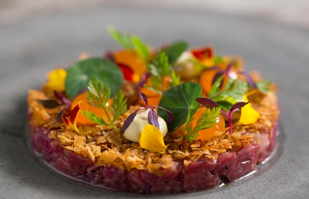 Beef tartare - clam mayo, confit egg yolk and preserved Daikon at Mume