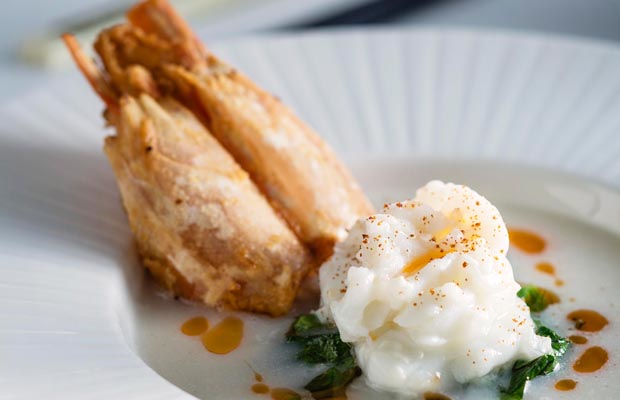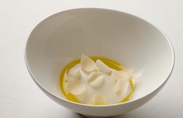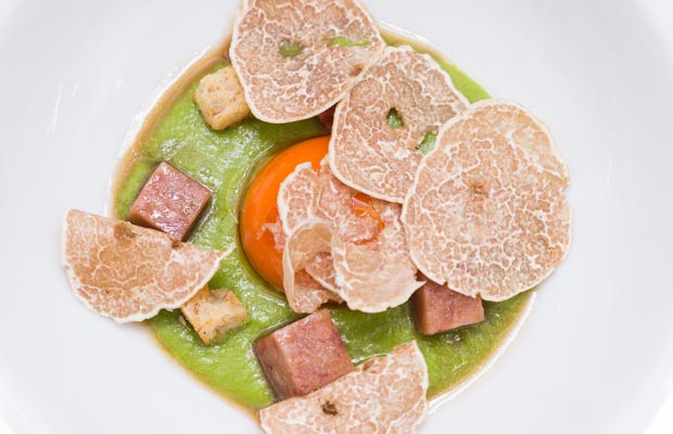 Confit egg yolk, crispy bread, cream of broccolini and cotechino and Alba white truffle at Otto e Mezzo Bombana