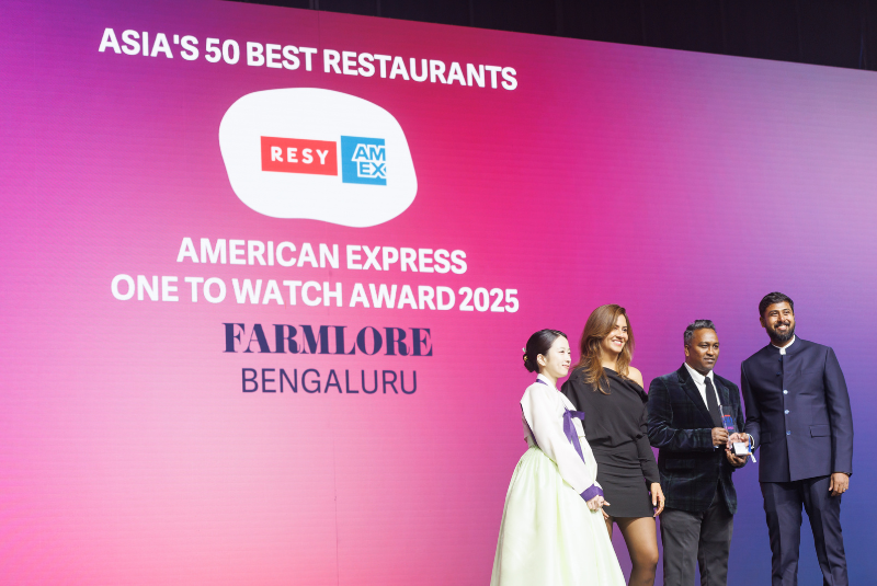 The team from Farmlore, an 18-seater dining experience on a 37-acre farm near Bengaluru, India, made its debut at Asia’s 50 Best Restaurants 2025, having won the American Express One To Watch Award. The restaurant is the brainchild of chef Johnson Ebenezer and entrepreneur Kaushik Raju and embodies a farm-to-table ethos, driven by seasonality, sustainability and local produce.