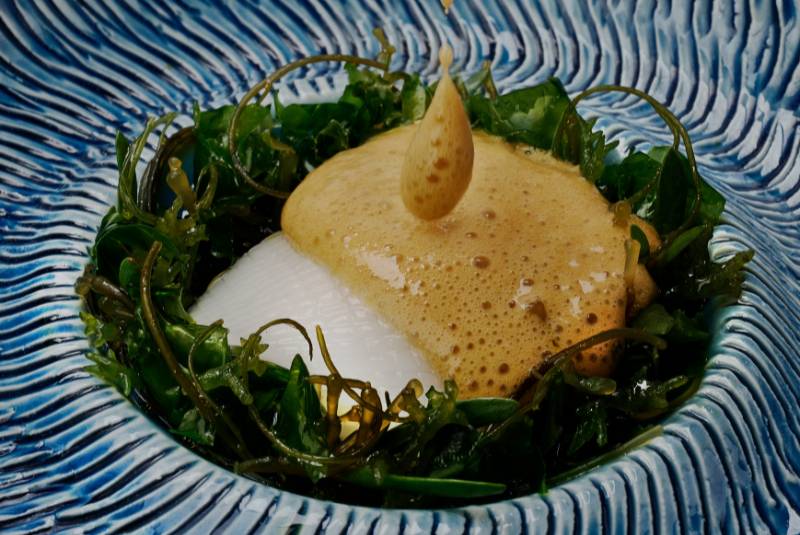 Chef Kevin Wong's multi-course Nusantara menu offers a selection of dishes featuring native spices and herbs, including the red seabream with sarawak white pepper gulai and lemongrass coconut broth. Chef Wong's signature is the mangrove wood-charred scallops with laksa leaf sauce paired with the in-house baked roti paung (Terengganu butter buns). Use the soft sweet buns to mop up the remaining sauce at the end. In keeping with sustainable actions (Seroja retains a Green Michelin star), all trimmings are re-imagined as elements in non-alcoholic beverages.