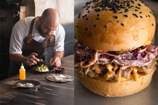 Dave Pynt preparing fennel, burrata, cheese and orange oil; the Burnt Ends sanger