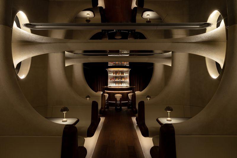 At the bottom of Basehall 02, a luxe food court in Hong Kong's porthole window-clad Jardine House, Artifact woos imbibers with a space seemingly lifted from the set of a sci-fi film. Arches enveloping the ceiling, travertine plaster-painted walls and leather-upholstered seating reference underground cisterns, bolstered by wave-shaped forms that recall the notion of rippling water. But it's the mirrored reflections, artificial lighting and sculpted curves of fibreglass that imbue them with the surreal air of a spaceship. In the entrance area, three-dimensional acoustic tiles reminiscent of speakers block out the noise of chatty Basehall 02 diners, inviting visitors to step into this futuristic portal.