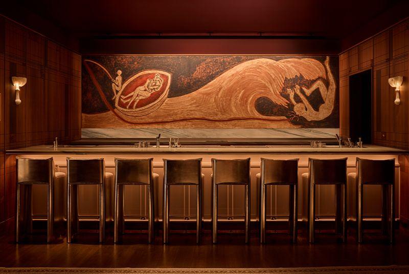 On the floor above the dining room of chef Daniel Humm's famed Eleven Madison Park restaurant awaits Clemente, a nod to the venerated art-laden restaurant and bar Kronenhalle in Zurich. A fresco from the bar's namesake, Francesco Clemente, crowns the stairwell, hinting at the Italian artist's large-scale murals inside. They are the stars of the moody salon-like lounge, deftly fusing with an array of vintage and custom furniture and soothing shades of burgundy, brown and gold. One of these monumental paintings even stands in for the backbar behind the intimate, well-organised solid hinoki wood chef's counter dubbed The Studio. Energy-conserving LED lighting glows against the walnut panels hand-carved with 'jewels' in American workshops, each one a striking art piece befitting of the room.