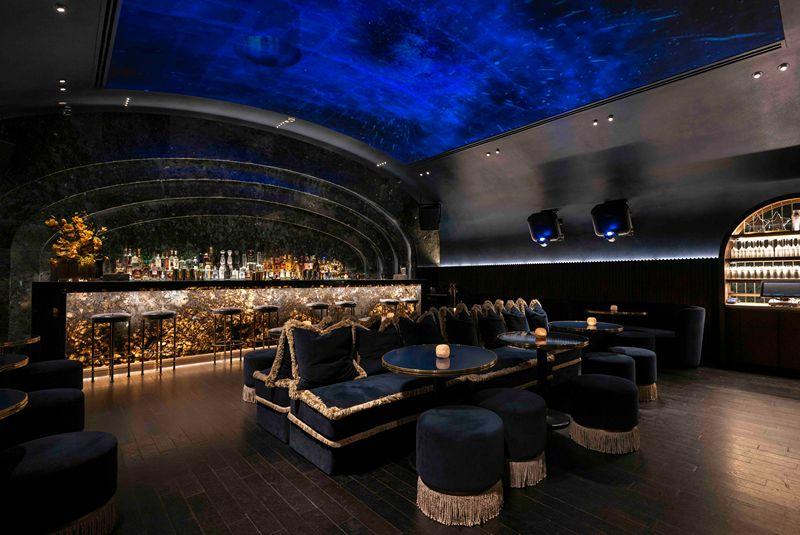 Originally, the storeroom at Athenian-inspired restaurant Avli by Tashas was meant to become a private dining room. Then, founder Natasha Sideris fortunately had a change of heart, ultimately transforming the underutilised space into Galaxy Bar. Awash in velvet, curves and metallic accents, buzzy Galaxy stands out with a stone bar and a vaulted celestial canopy flaunting hypnotic ever-shifting digital projections that conjure the night sky. Swaths of midnight blue fittingly call to mind Greece, and an optimally placed DJ booth ensures that an evening of laidback lounging organically morphs into a full-blown party.