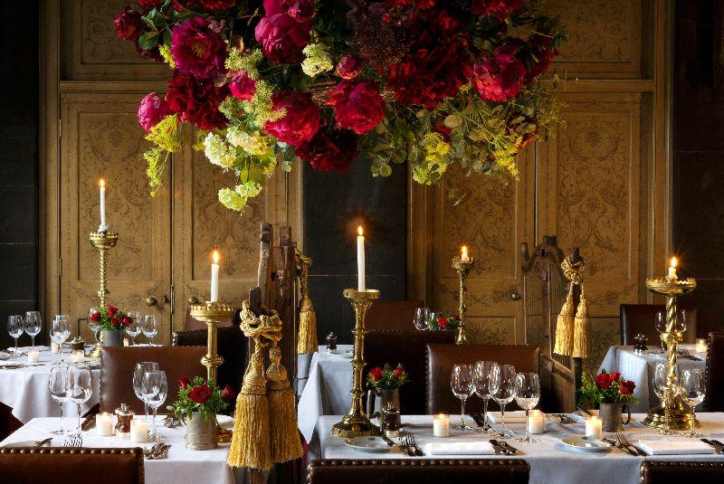 Fresh flowers, hanging tapestries and carved oak panels enliven The Witchery's Secret Garden dining room (Image: The Witchery)