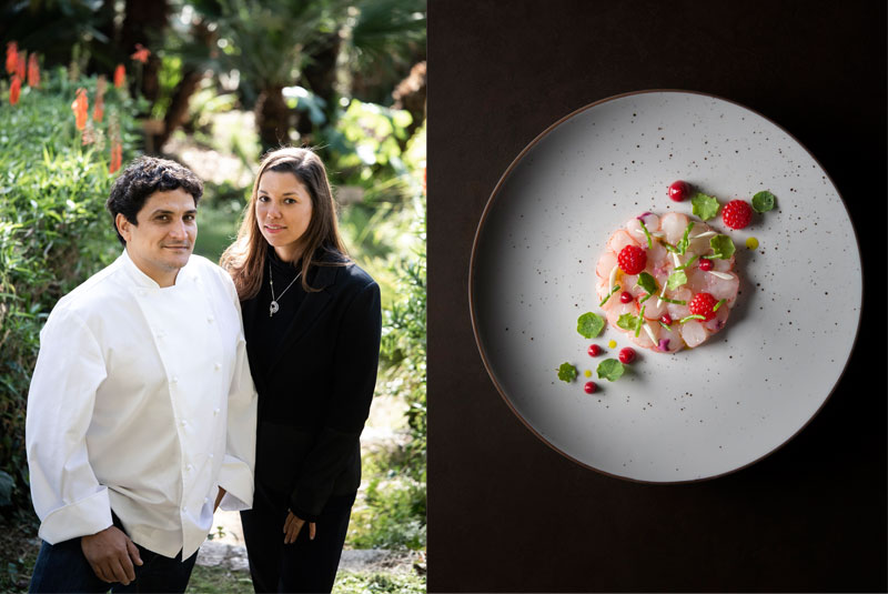Mauro and Julia Colagreco (image: Matteo Carassale); Mirazur dish with Sanremo prawns, raspberries and raw almonds (image: Eduardo Torres)