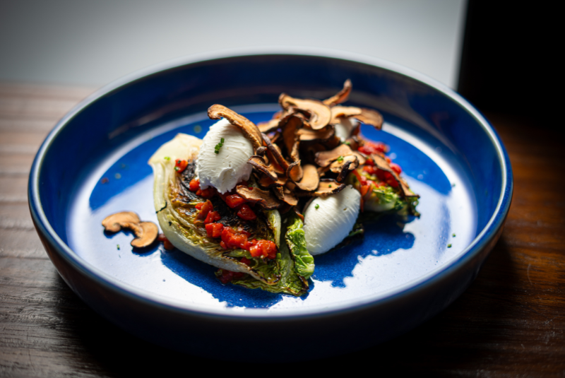 Camel cheese with baby gem, piquillo peppers and crispy shiitake