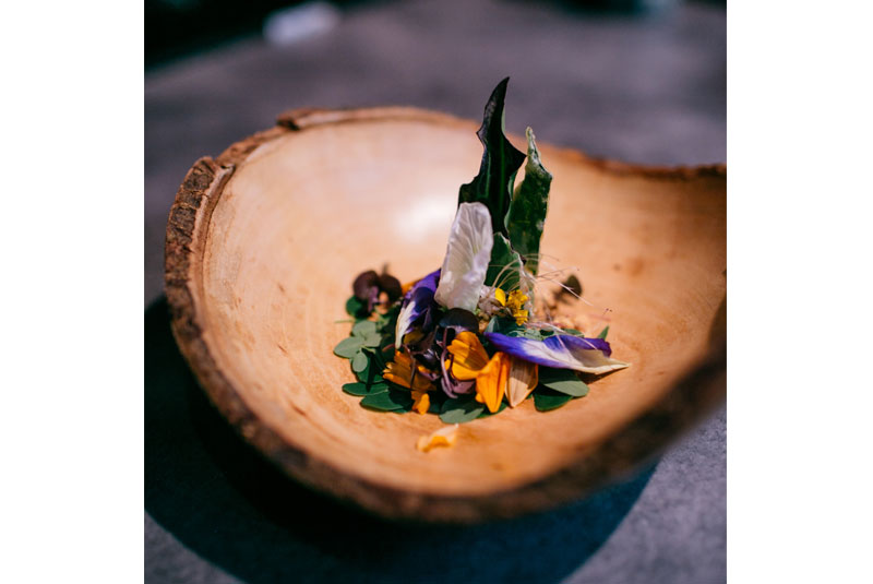 “This dish is my homage to the local farmers,” says Han. The chef sources most of the produce for Labyrinth from Singapore’s edible gardens. “These gardens were first set up not to make money, but to encourage community and to use the available spaces on rooftops or balconies to go green. The incredible thing is that they support autistic people by giving them jobs on the farm, and they also practice sustainability, using fly larvae to break down compost and then use it on the farm.