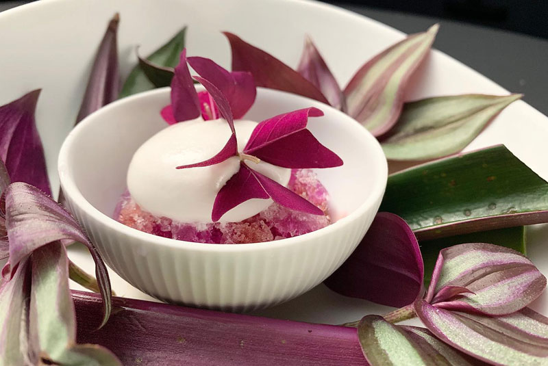 It was chef Han’s innate curiosity that led to the creation of this unique dessert. “It features oyster plant, also known as Moses-in-the-cradle, a native Singaporean ingredient traditionally used to make tea – but I turned it on its head and made it into shaved ice. It is bright purple, which gives the ice this natural colouring. Then, one day I saw this weird plant growing on the roadside. I brought it to the edible garden farmer, who showed it to his uncle, the most senior farmer – it took about a month to find out what it was. It’s called wandering Jew.