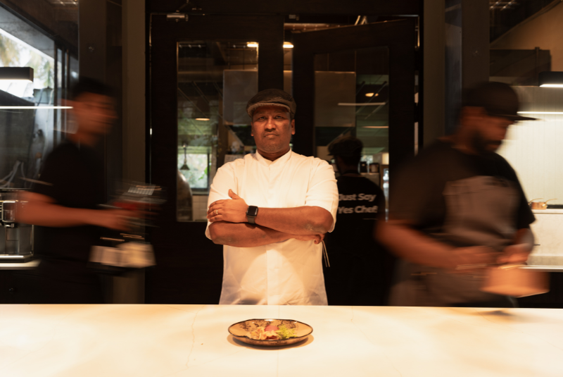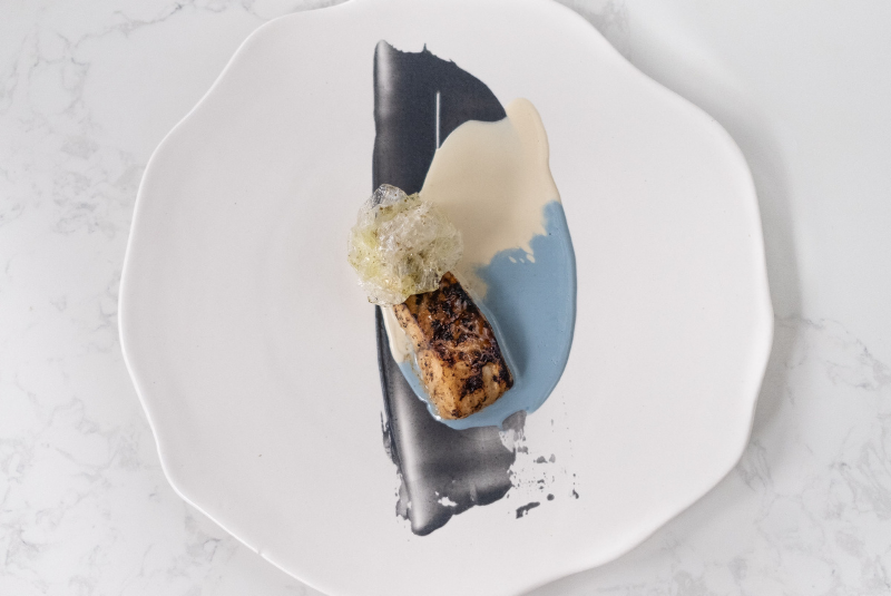 The dish features Kochi snapper and two sauces: a coconut-based white sauce and a striking blue sauce made with spirulina to represent the ocean. It’s topped with what looks like crinkled plastic wrap, made from potato starch. Using molecular gastronomy, he mixed glyceride with coconut oil and charred coconut shells to add a splash of black underneath, symbolising an oil spill. The message is clear: “Save the ocean.”