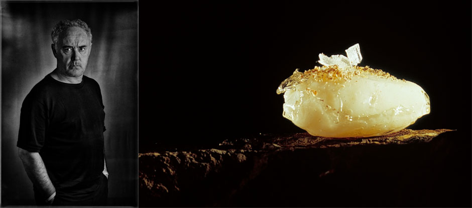 Header: Ferran Adrià (portrait: © Gianni Villa) and caramelised quail’s egg (image: El Bulli Foundation)
