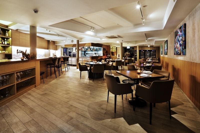 The chef had a big hand in the design of the airy dining room, where warm woods on the walls and floors offset the sombre grey-leather seating. “There is also a lot of natural light,” he says. “Whenever I walk into the restaurant, it feels like home.” The dining room accommodates 25 diners, with a further six seats for customers who want to get up close and personal with the team of 10 chefs in the open kitchen.