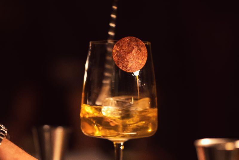 The Strawberry Salsa cocktail is finished with a dehydrated disc of fruit leather made with strawberry and tomato