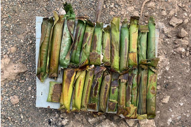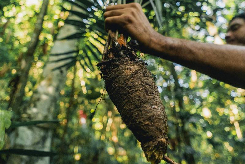 Guayiga root, native to the Dominican Republic, is traditionally wrapped in plantain leaves and baked to make guayiga bread