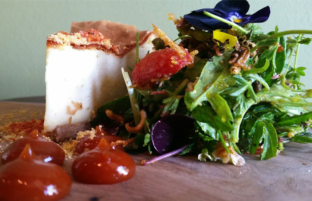 Smoked cheesecake, spiced tomato vinaigrette, sunflower, garden shoot salad at Foliage
