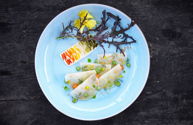Olive oil pan-poached artichoke, coriander, powdered carrot cream, fresh coriander pea cream, yoghurt and artichoke at Neolokal (image: Seren Dal)