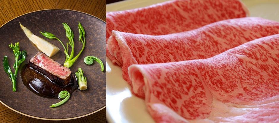 Header images: restaurant Amber's wagyu A5 sirloin steak and Saga beef