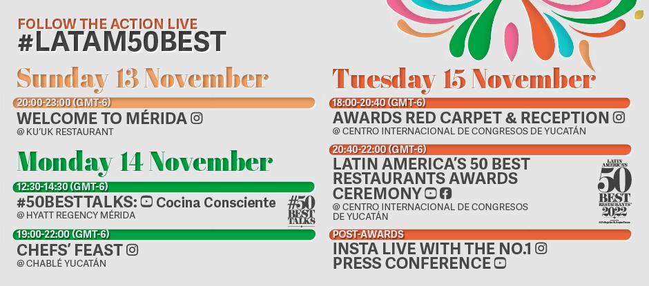 The 10th annual edition of Latin America’s 50 Best Restaurants, sponsored by S.Pellegrino & Acqua Panna, will be unveiled in Mérida, Yucatán, on Tuesday 15th November 2022 at 20:40 local time. Check out the digital programme for the lowdown on all the events, be part of the action by tuning in to the livestream on Facebook and YouTube on 15th November, and read on to discover everything 50 Best has in store