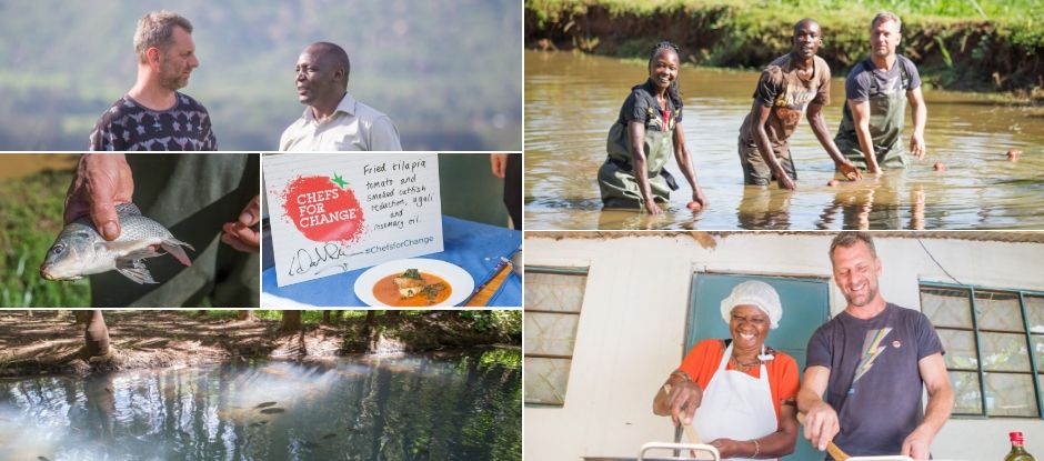 Taking to the water in his waders, Dale-Roberts experienced first-hand the process involved in sizing the fish. He assisted in training the locals in how to assess quality specimens, while Chefs for Change representatives educated farmers on how to access high-value markets, showing the benefits of farmed fish over wild-caught.