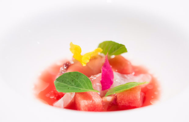 Black barracuda, watermelon and Thai basil consommé at Le Du