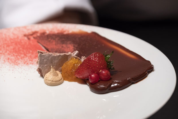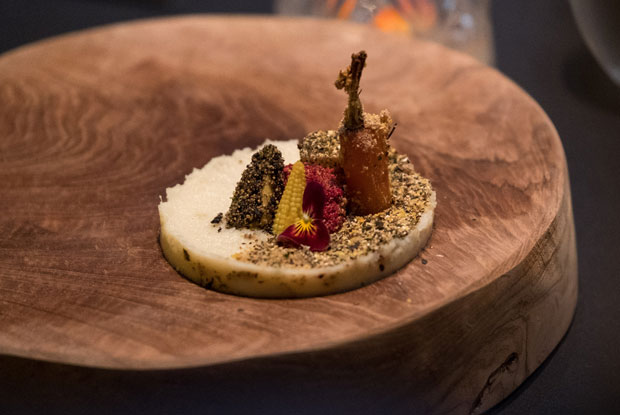 Chef Martin Milesi explains: “This dish is a version of an ancient recipe from Argentina, Chile and southern Peru called curanto. Native Americans used to make big holes in the earth and put layers of hot stones, leaves and vegetables, covered by soil. After cooking for four to six hours, they ate the food that was cooked under the earth. In this case, we made a version of curanto with edible soil, cassava flower and polenta; a celeriac, leek and Jerusalem artichoke puree; and avocado, olives, sweetcorn, carrots, cassava and beetroot cooked in the oven with the edible soil.”