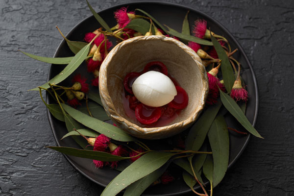 Red flowering eucalyptus ice cream, quandongs stewed with rhubarb and mead at Brae